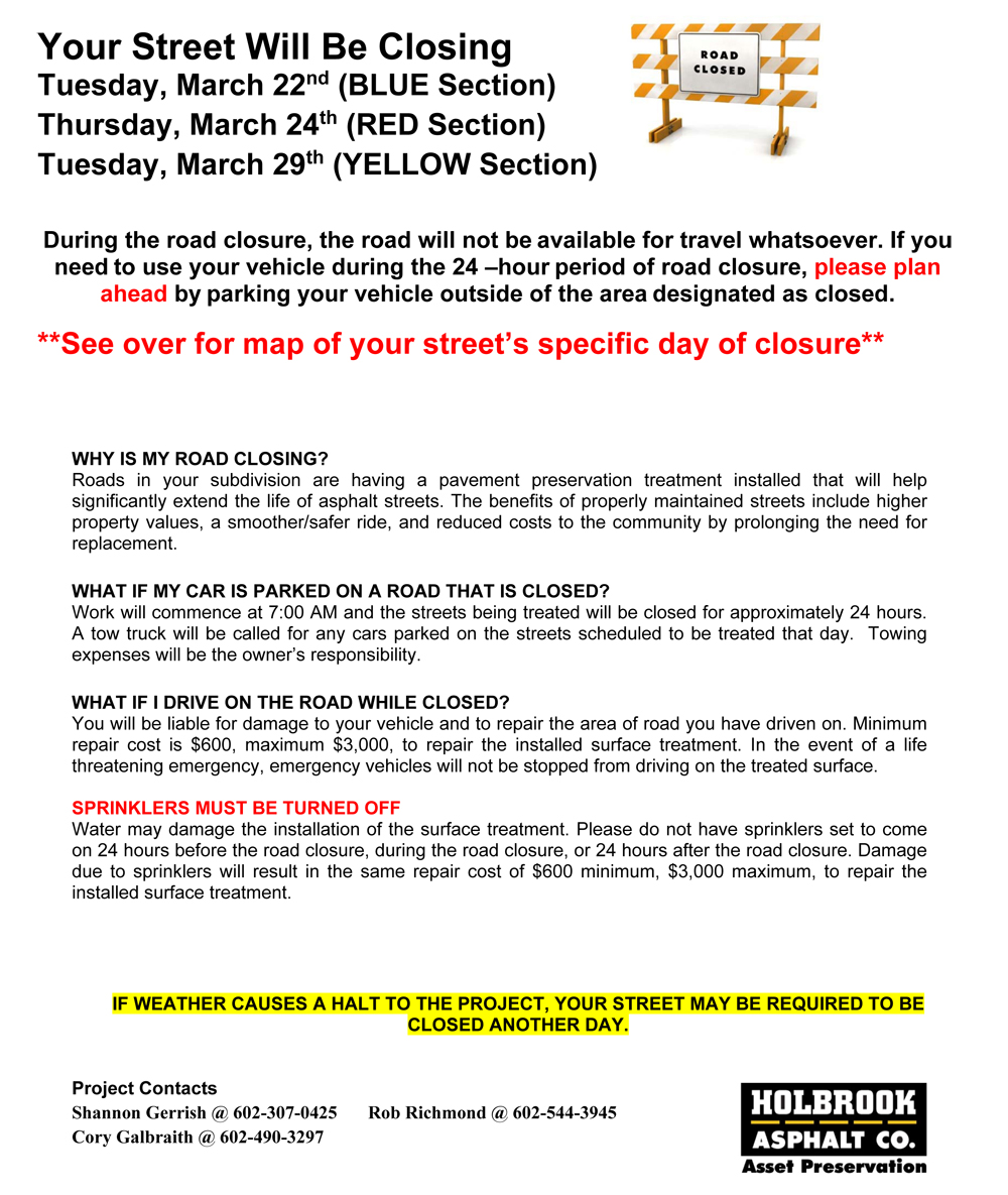 Provided the weather holds up, Holbrook Asphalt will begin doing crack repair work on the streets in our subdivision and on the main road coming into the subdivision.