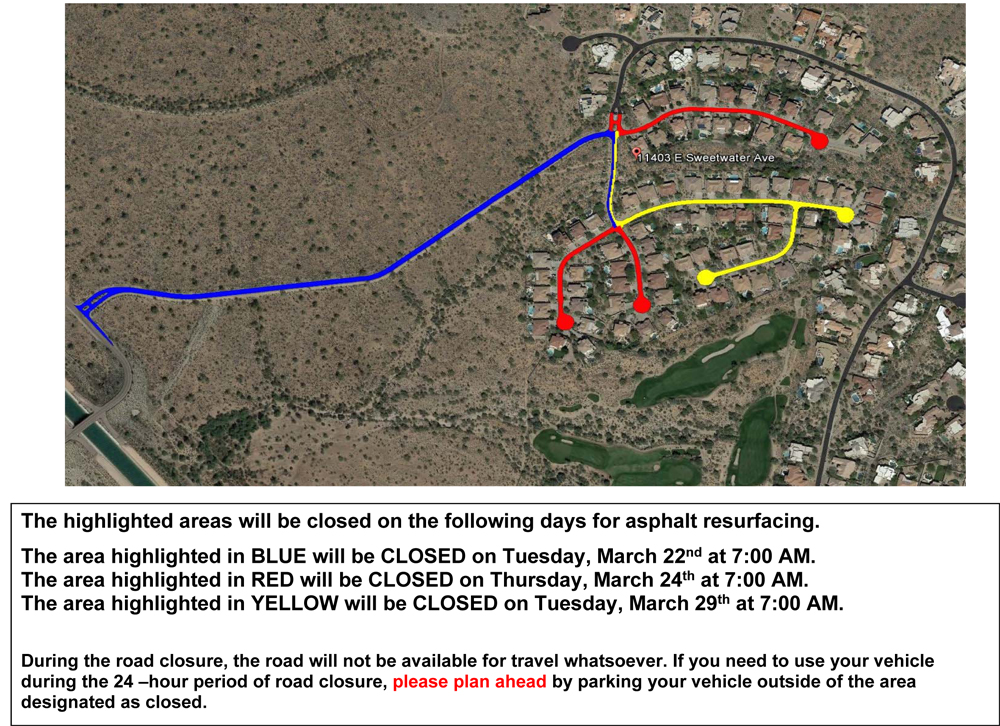 As in the past, our neighbors in Ancala are working with us and they will be allowing us to enter and exit our subdivision through their community on the one date that the main entrance road is scheduled to be shut down.